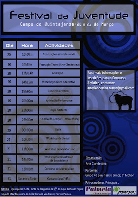 Sai de casa e vem experimentar um fim de semana cheio de actividades novas, desde worshops de malabarismo, stencil, breakdance e música alternativa, até formações de Teatro. Terás, ainda, a possibilidade de ver a peça "O Arco do Tempo", pelo Teatro Brinca e algumas performances, pelo grupo Arte Clandestina. Para além disto podes, anida, participar num Concurso Artístico, onde podes mostrar a tua arte.